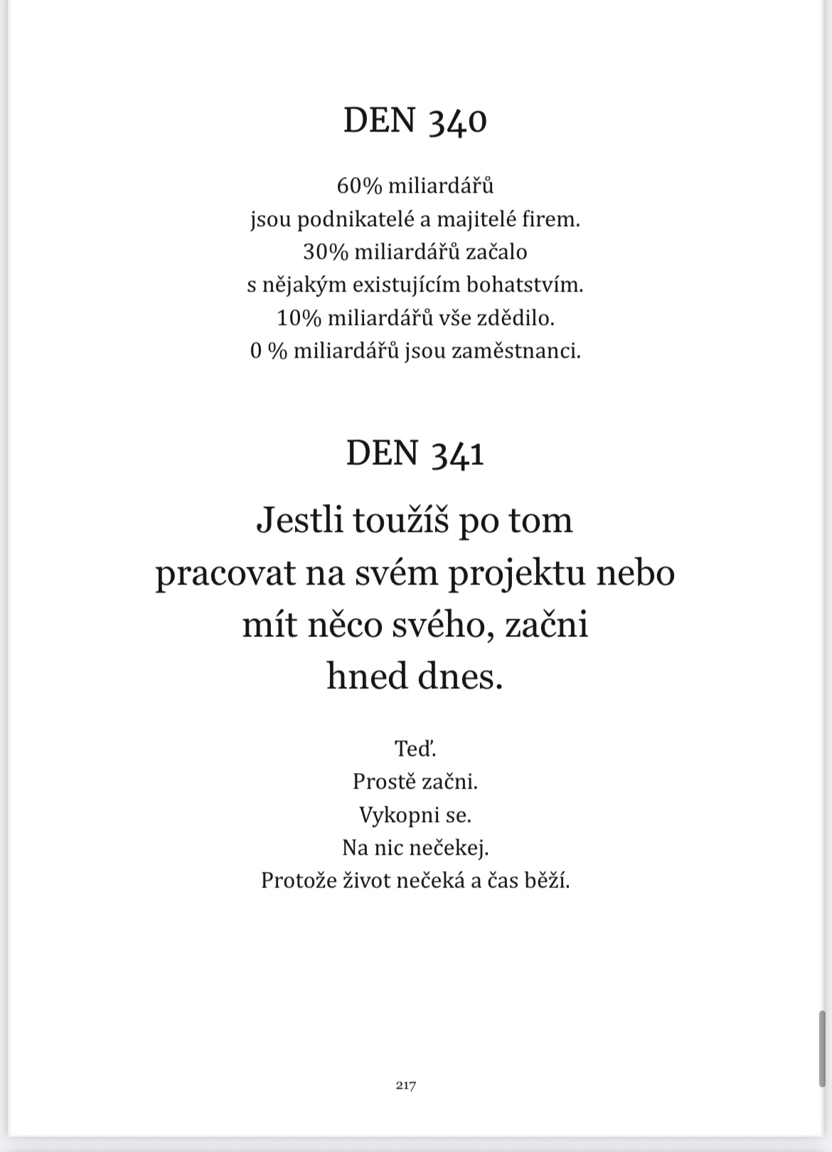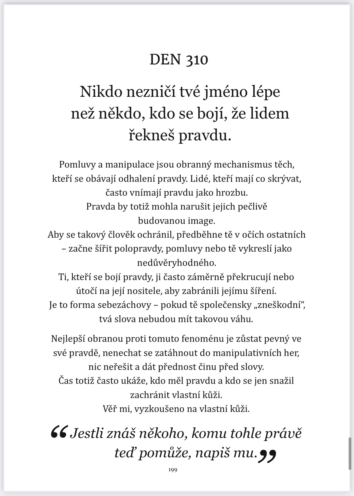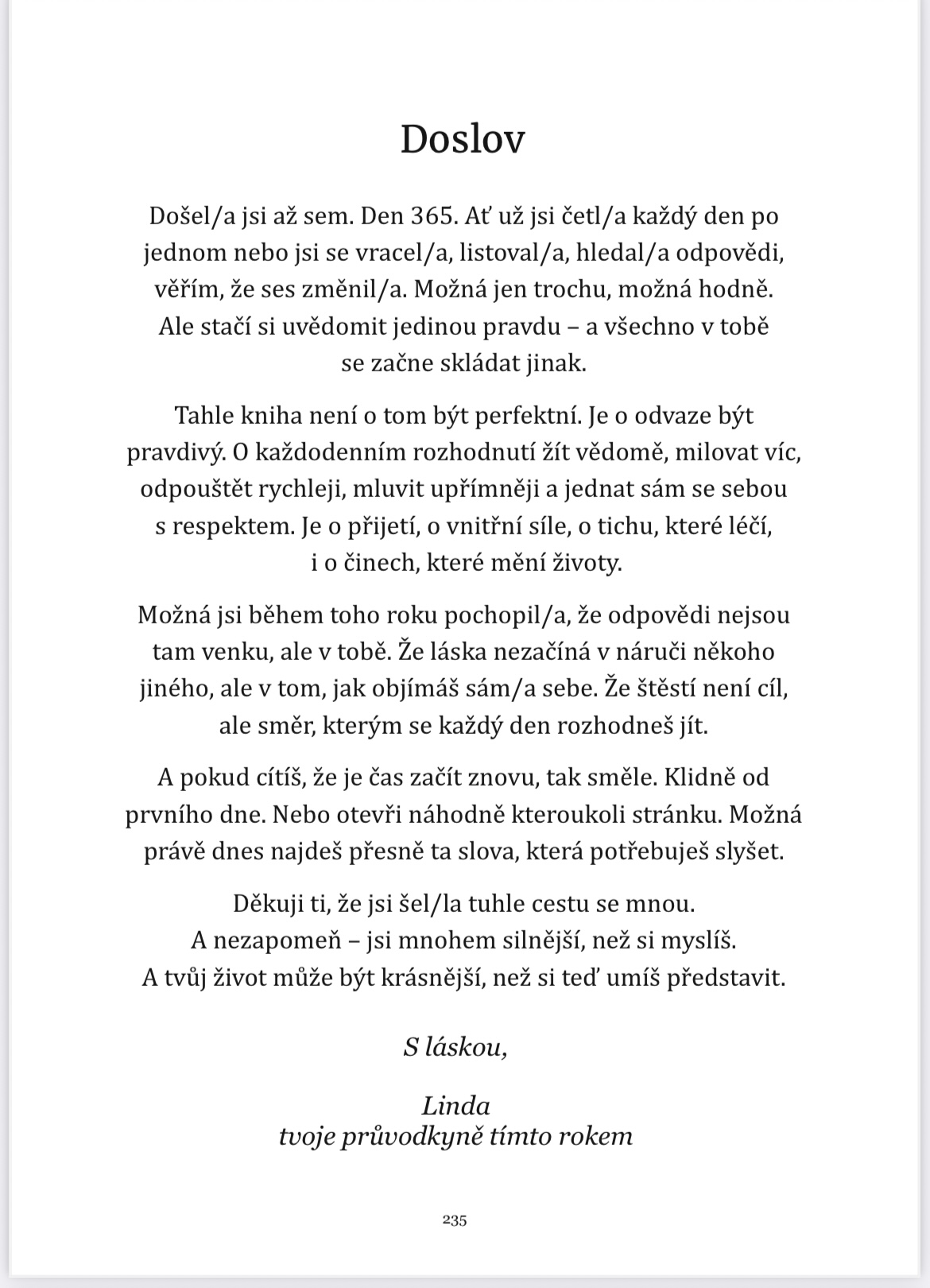 Kniha je úžasná, doporučuji ji všem, kdo chtějí svůj život skutečně žít. Každý den knihu otevřu a její slova mě provází celým dnem. Někdy mám pocit, že je psána přímo pro mě :-). Je to kniha, která ti může změnit každý den. Děkuji.
